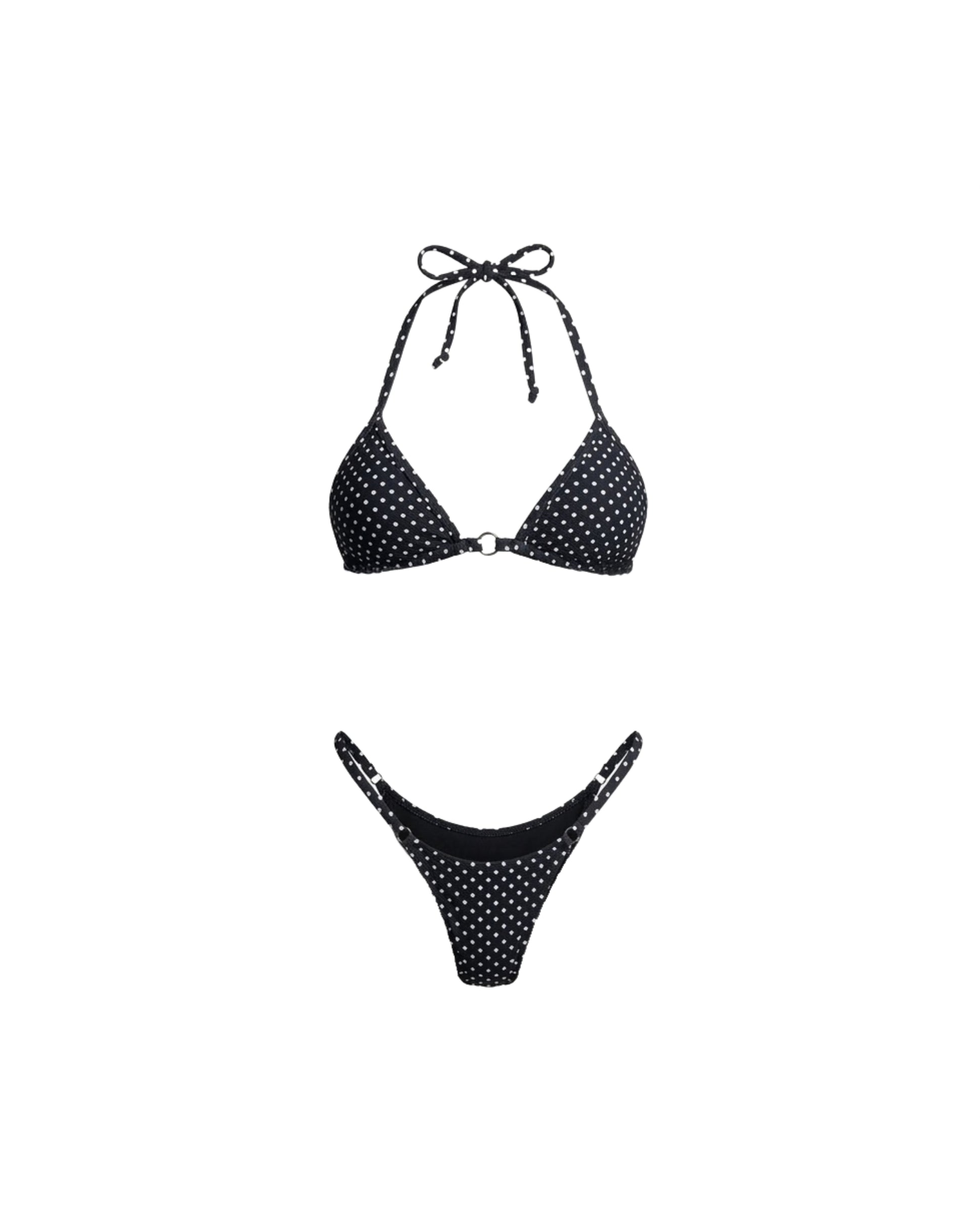 Meet the Bulería Bikini Top, a timeless triangle silhouette designed to highlight your natural shape with effortless elegance. Featuring delicate polka dots and a refined center ring detail, this piece brings a playful yet sophisticated touch to your swimwear collection.